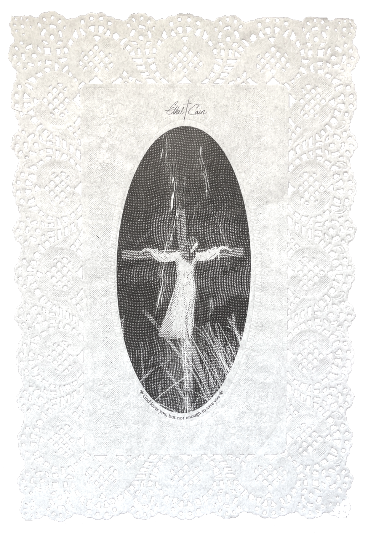 The front cover retains the original album photo but is reimagined through collage and cyanotype-inspired treatment to deepen intrigue. A cross-shaped structure is embedded into the composition, and the eyes of the main subject were purposely inverted to create an unsettling, foreboding mood. The omission of text highlights the art direction and invites viewer interpretation. The back cover continues this visual narrative with a blurry, burned-lace cross motif, visually representing the tension between faith and fragility.