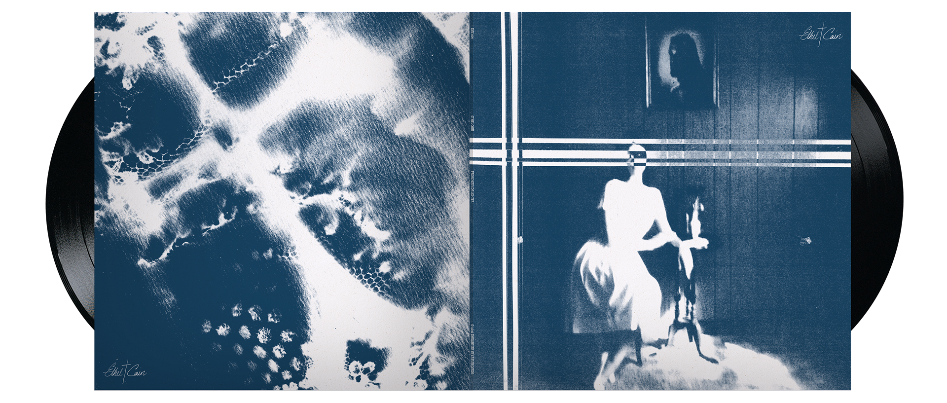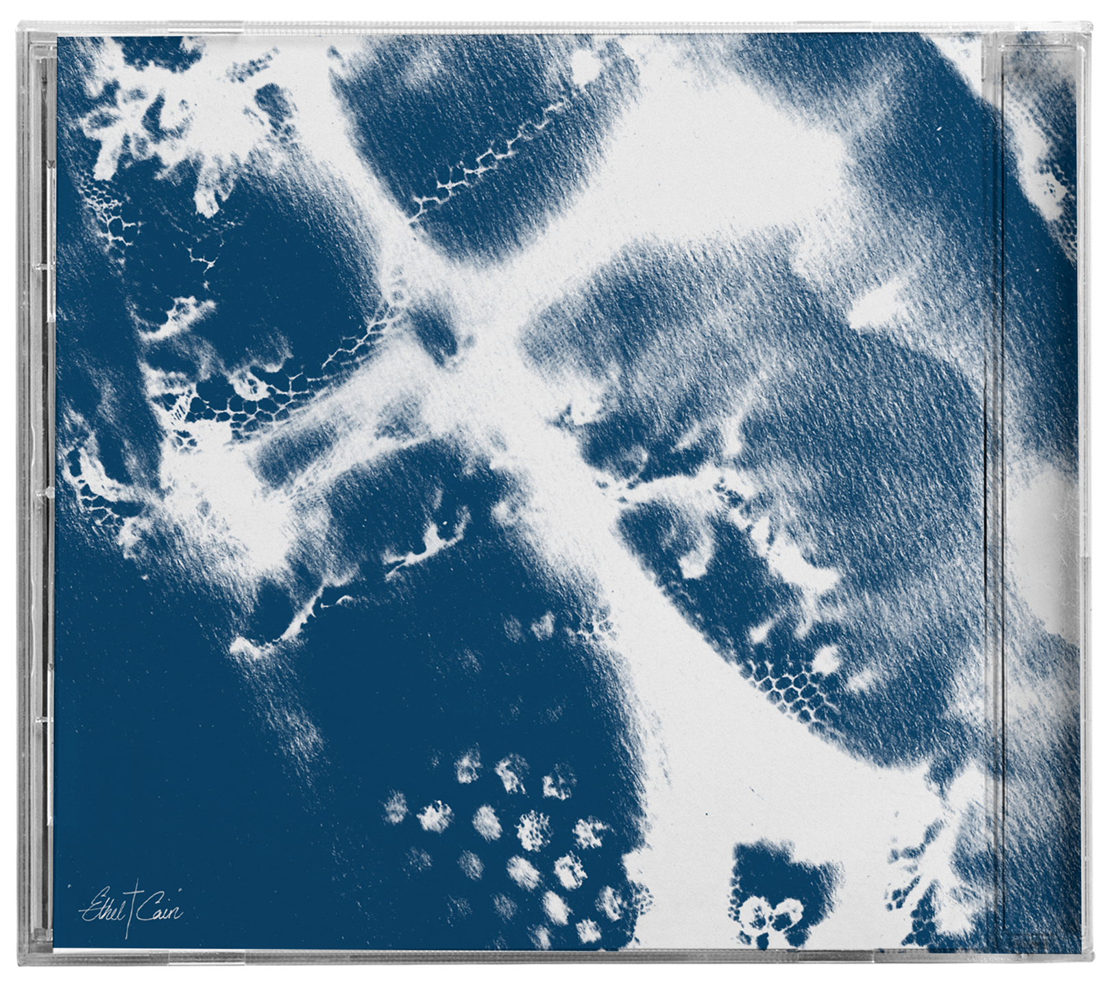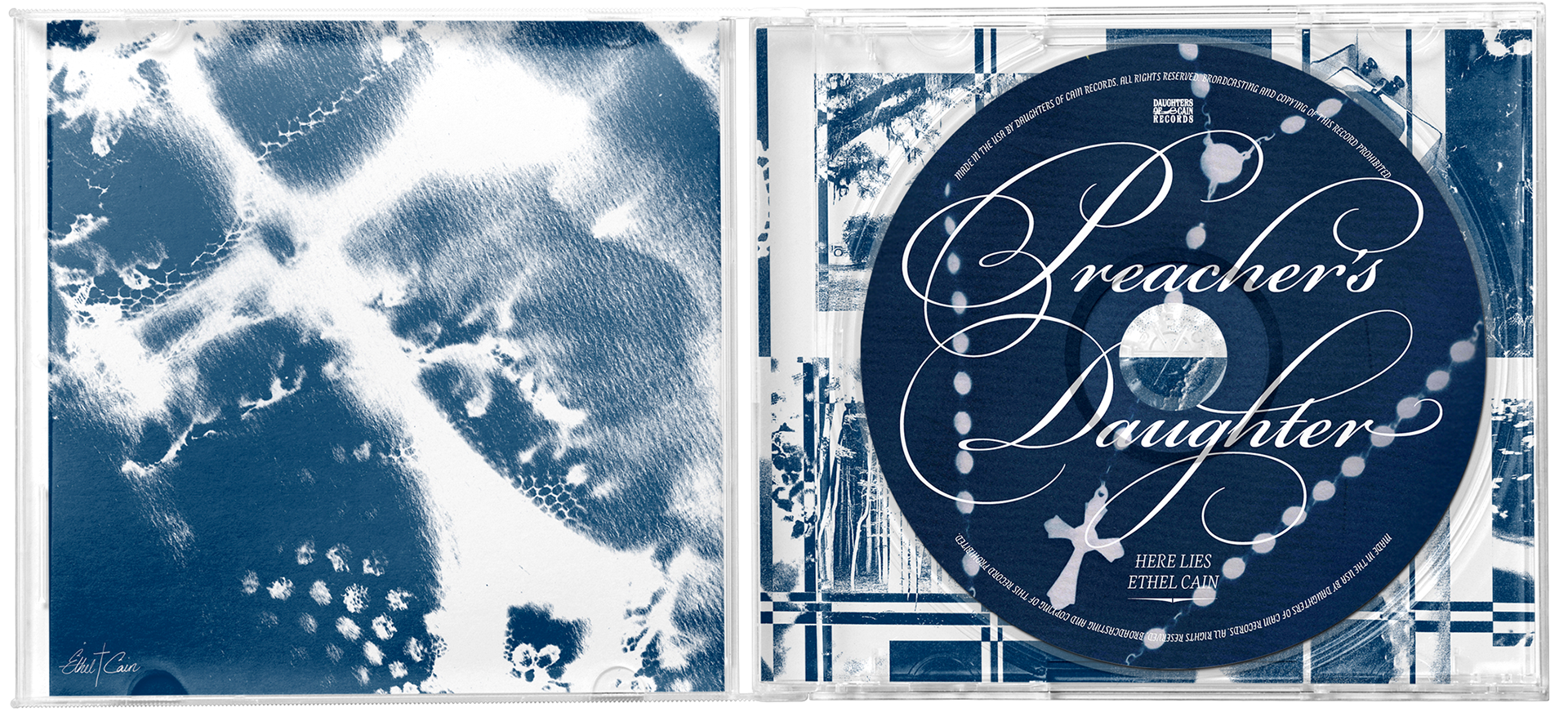 The disc design mimics a similar style to the record labels, and adapts the concept to a new format. A separate necklace cyanotype image was used, and on a diagonal angle, creating intrigue through an offset element. The phrase “Here Lies Ethel Cain” adds narrative weight and positions the music as a posthumous offering.