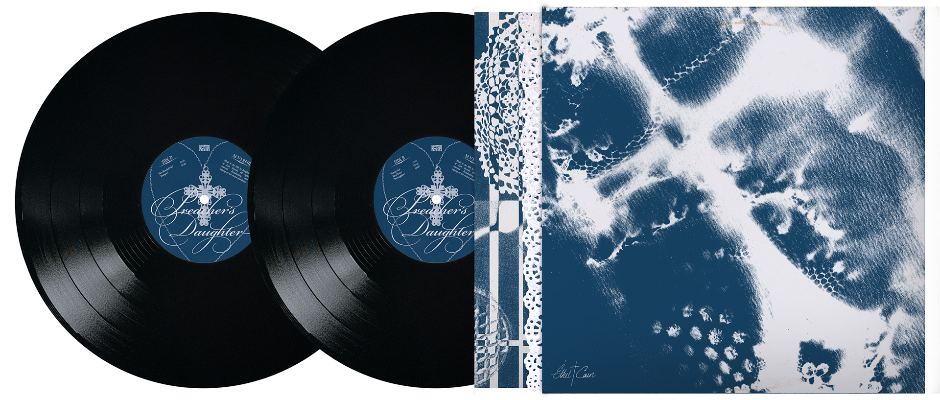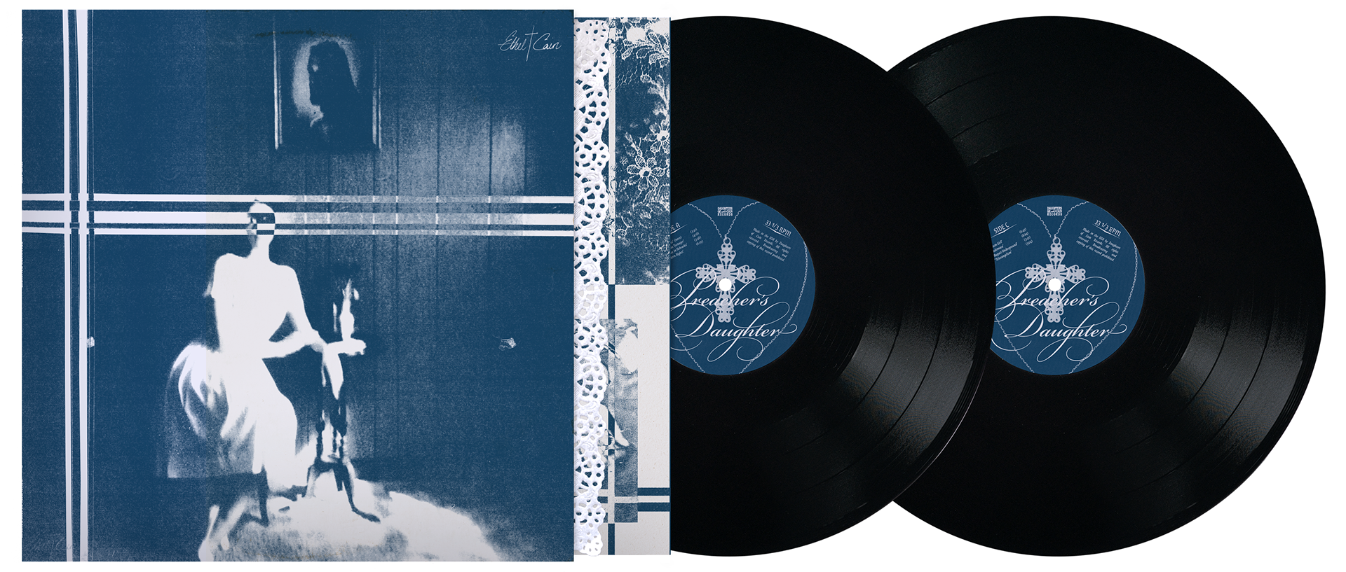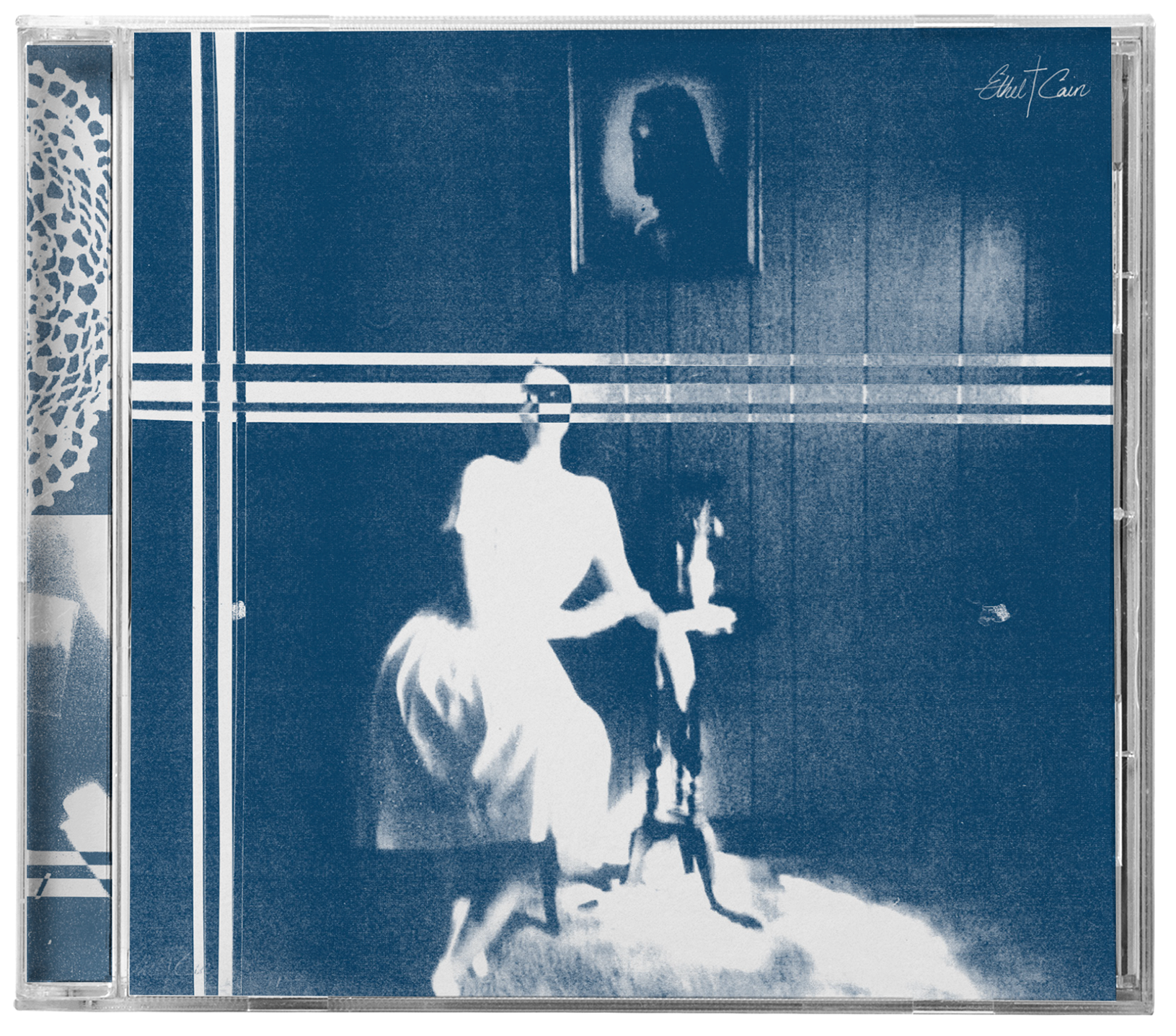 The disc design mimics a similar style to the record labels, and adapts the concept to a new format. A separate necklace cyanotype image was used, and on a diagonal angle, creating intrigue through an offset element. The phrase “Here Lies Ethel Cain” adds narrative weight and positions the music as a posthumous offering.
