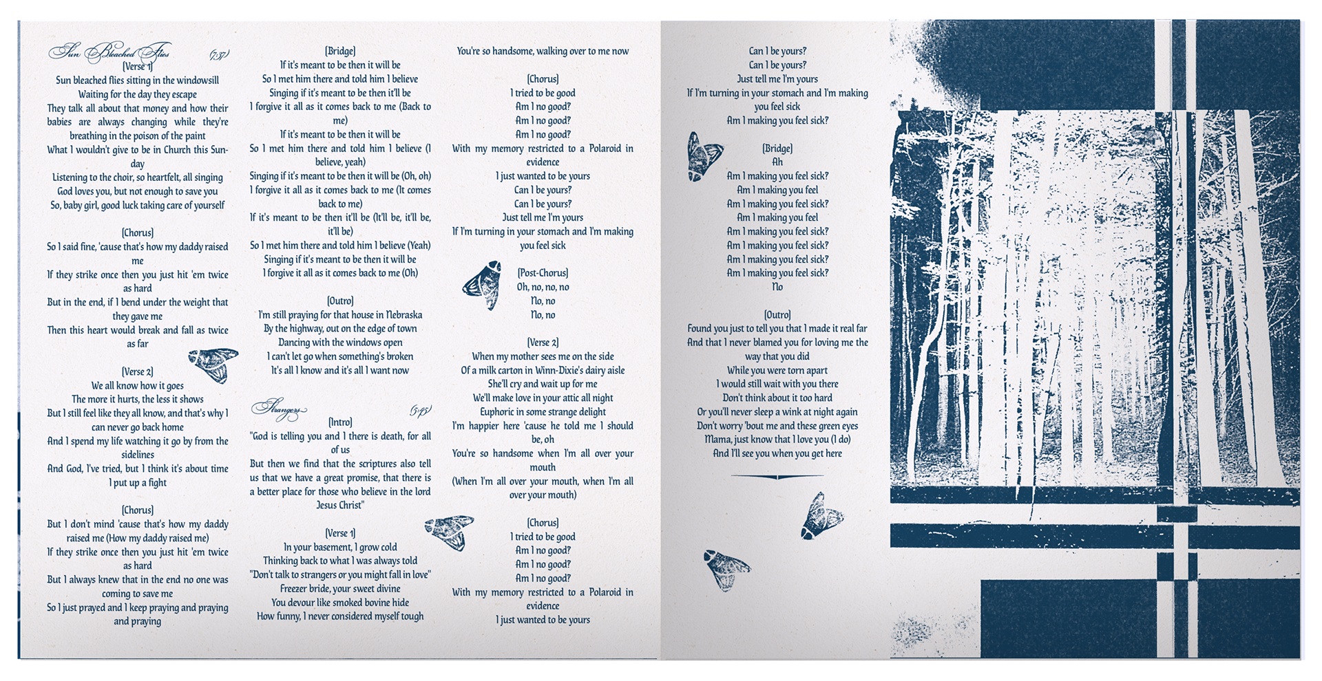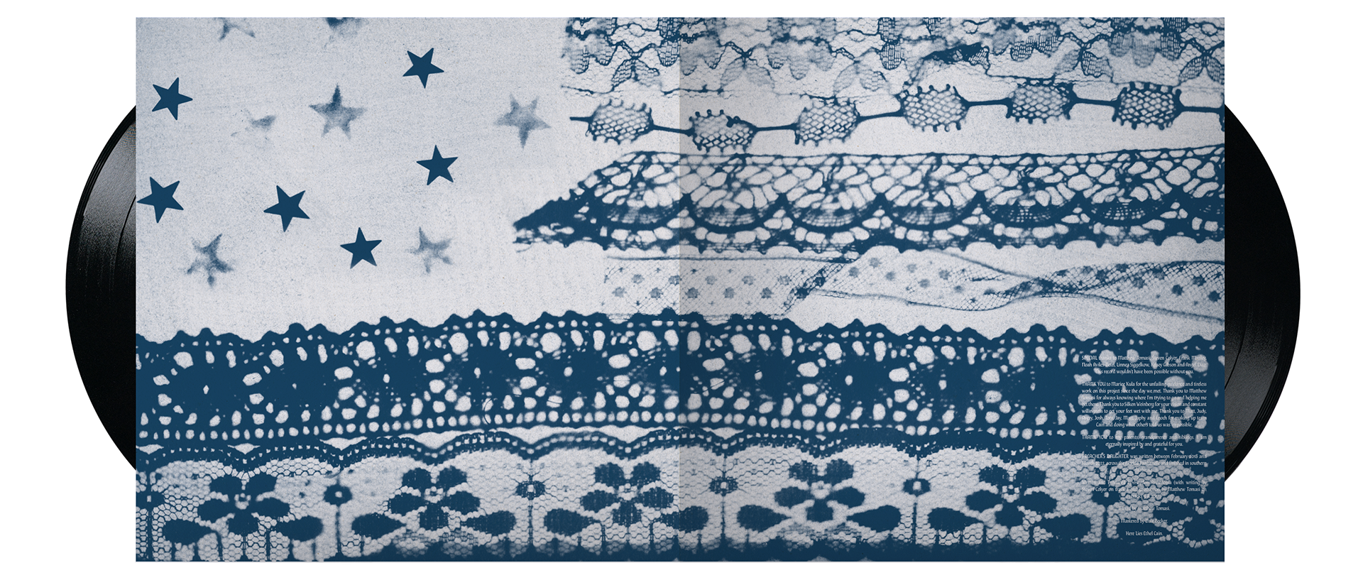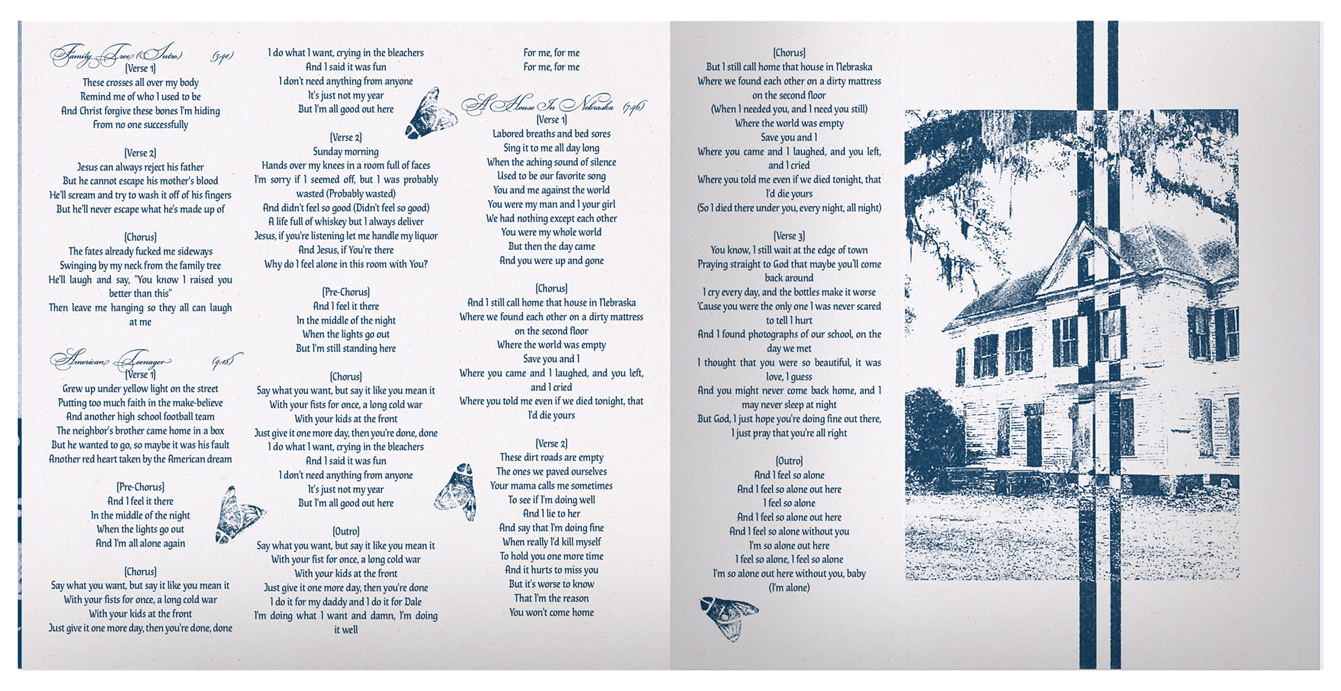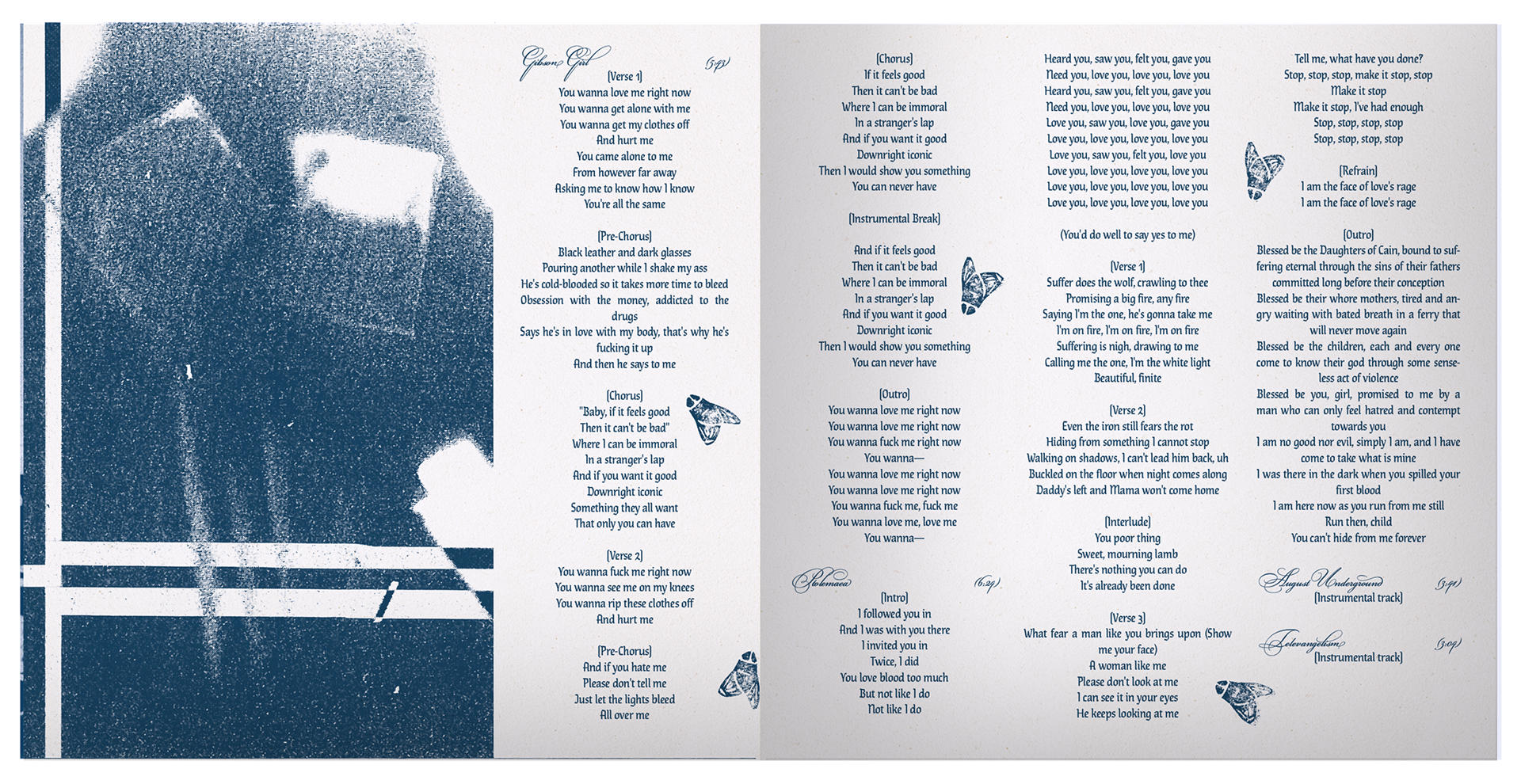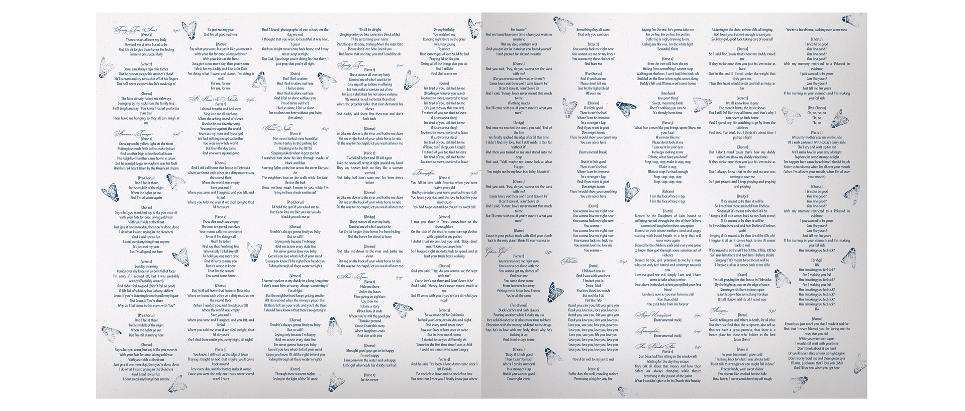 The insert booklet contains many of the same elements from the vinyl packaging, including the American flag cyanotype/credits on the opening spread, followed by lyric sheets of the same style. Relevant segments of the Narrative Grid are shown throughout the booklet, as snippets of the larger visual story.