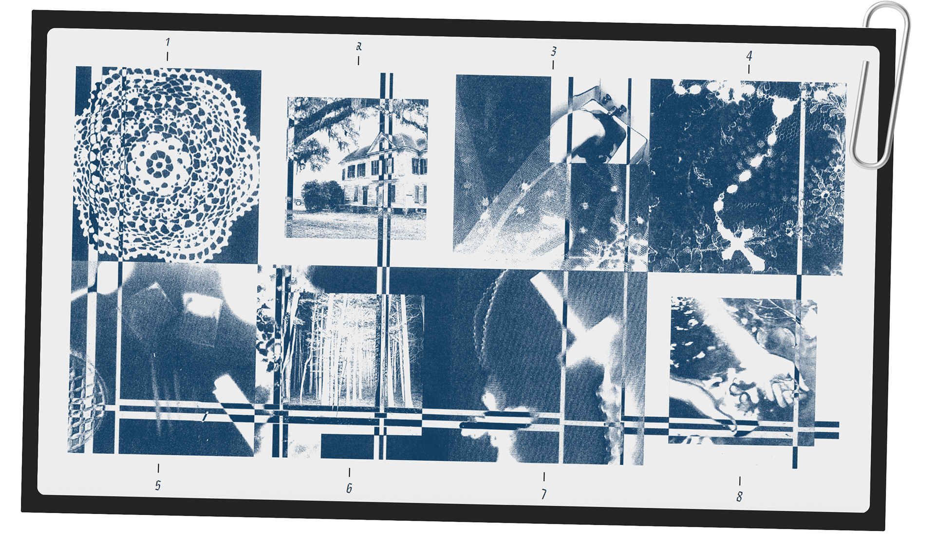 7. Using multiple exposures and unbalanced cross imagery, this tile depicts Ethel’s inner conflict with faith. The layered symbolism and yin-yang-like layout suggest a duality - her wavering belief in God and the tension between salvation and damnation.