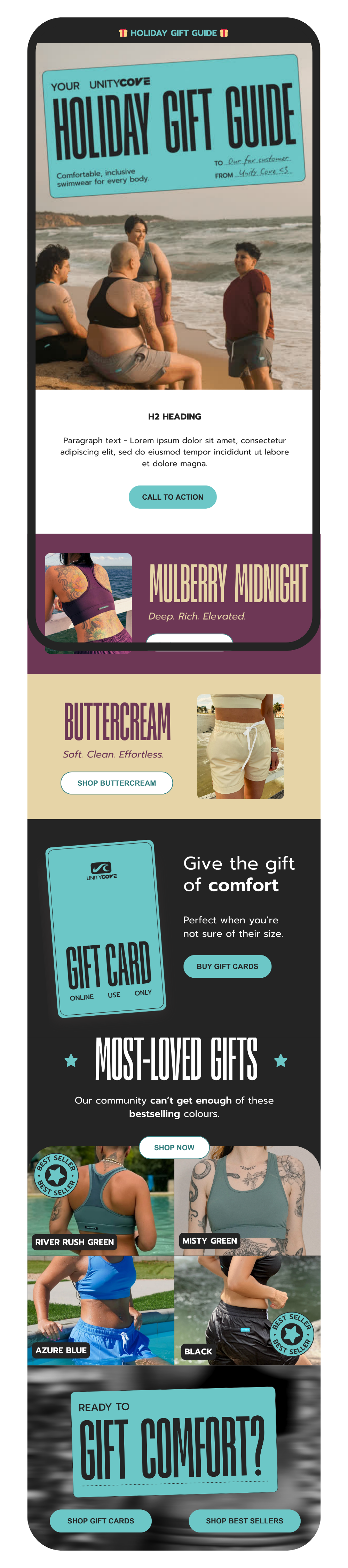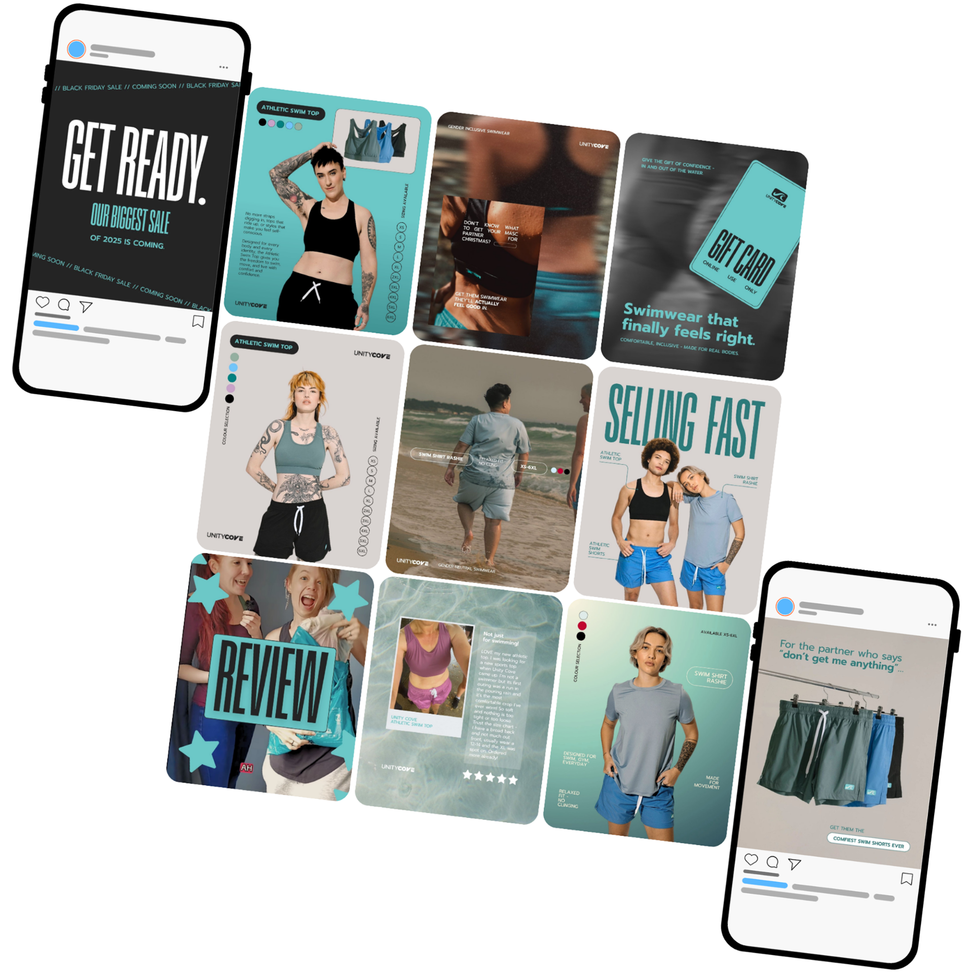 The largest transformation for Unity Cove so far has been the creation and implementation of a consistent, brand-focused social media identity. Each post visually reiterates the brand's ethos and market positioning as inclusive, queer-first and premium-quality. Repeated brand elements (colours, fonts, layouts) ensures UGC and brand photography works together seamlessly within the feed, creating an uninterrupted viewer experience whilst building brand equity through consistent visuals.